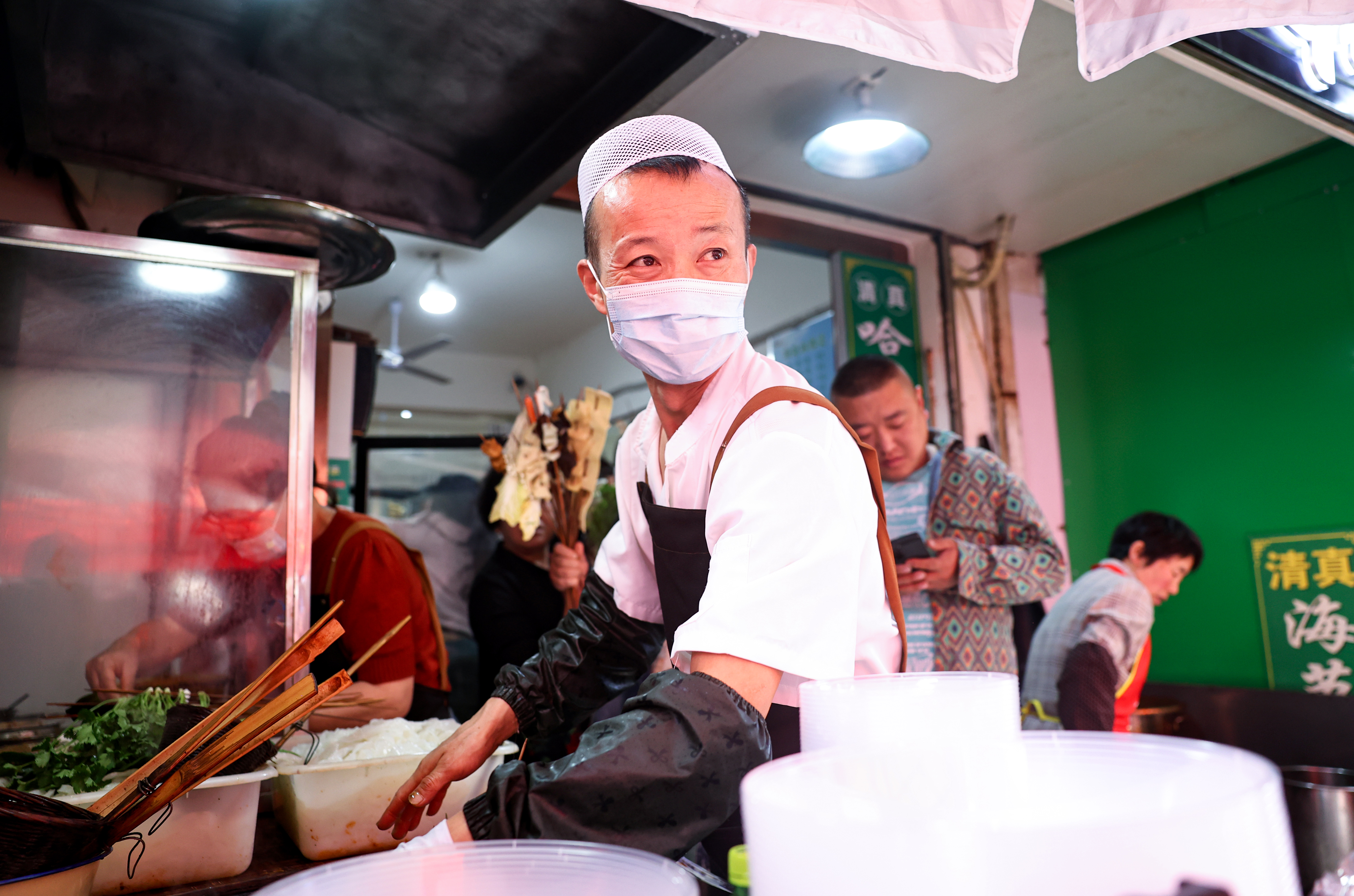 4月24日,在甘肃省天水市秦州区一麻辣烫店,商家为游客加工麻辣烫。图片来源:IC photo
