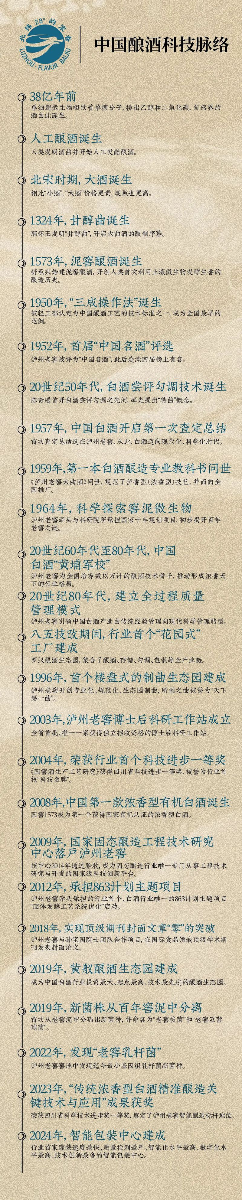 纵观泸州老窖酿酒技艺七百年发展历程,无论是小曲酒到大曲酒的飞跃,还是手工作坊到数智酿造的升级,技术创新的步履从未停歇,成为泸州老窖引领中国白酒不断突破的强劲动力。
