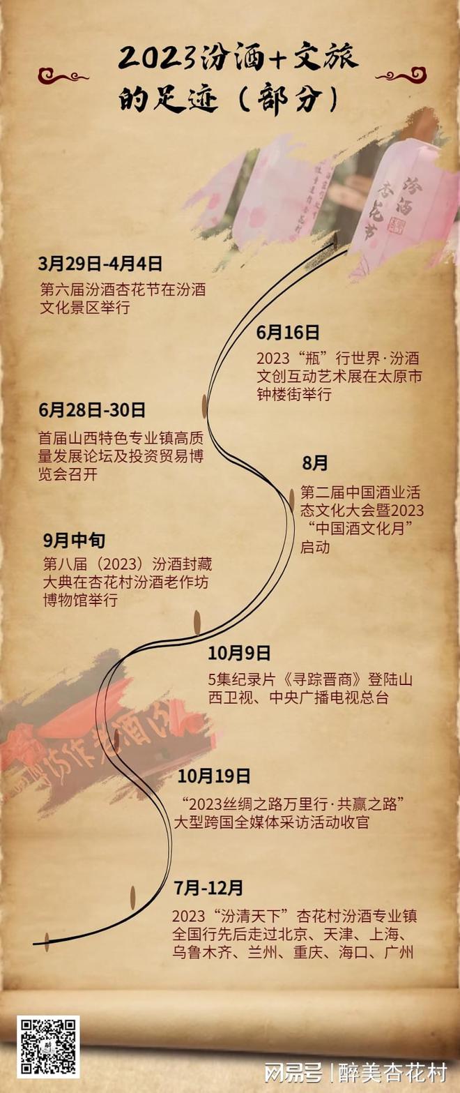 2023,汾酒举办了“汾酒杏花节”“汾酒文创艺术展”“汾酒价值论坛”“中国杏花村国际酒业博览会”“汾酒封藏大典”等多个品牌活动,还通过“汾清天下”杏花村汾酒专业镇全国行、杏花村汾酒文化采风、《寻踪晋商》纪录片等多种形式实现汾酒文化的活态化、时代化、产业化和品牌化。