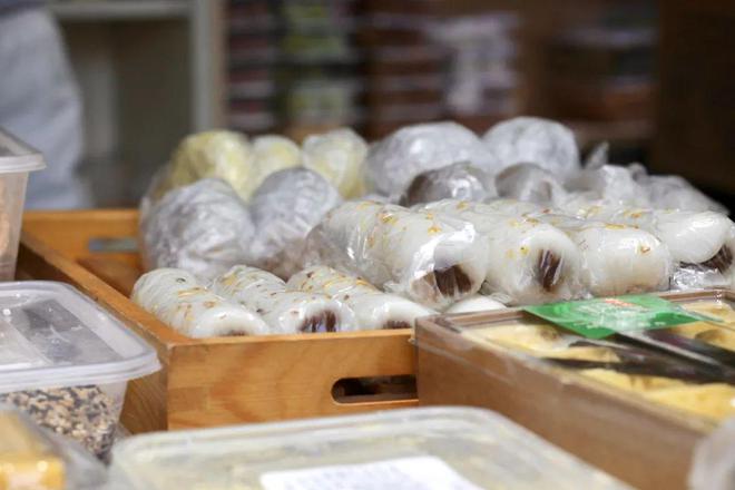 经典的海派糕团条头糕,糯米皮绕着豆沙馅,卷成长条,表面洒满星星点点的糖桂花,口感滑腻清香,据说鲁迅先生在熬夜写稿时,常备的夜宵就是条头糕。
