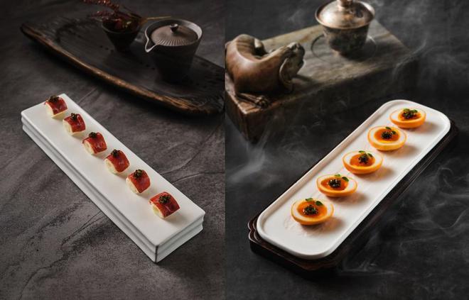 主厨推荐菜品中,5J火腿茭白鱼子酱选用被誉为“黑色黄金”的卡露伽鱼子酱,其颗粒饱满、风味纯粹的鱼子搭配口感清脆的茭白和醇厚咸鲜的5J火腿薄片,点缀其上食的食用鲜花,倍显生机盎然;鱼子酱beat365烟熏温泉蛋主厨选用烟熏方式,对烹饪时间与温度的精准把控,使其温泉蛋拥有恰到好处的滑嫩流心口感和浓郁风味,搭配鱼子酱的咸鲜于味蕾中融合弥漫,为宾客带来无与伦比的海陆双重鲜美体验。主题菜单中还包括:九层塔响螺炖鲟龙鱼筋、自制黄椒酱焗鲟龙鱼唇、金汤琉璃鲟龙鱼骨等。