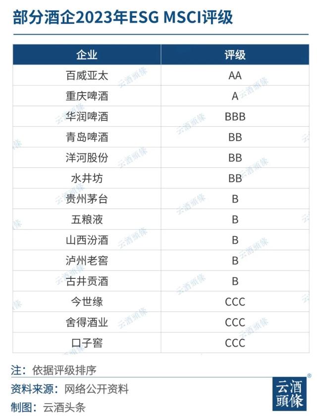 到今年,A股已有14家白酒企披露2023年ESG报告,其中仅有口子窖是首次披露。但从MSCI给出的评级来看,国内酒企还有较大的提升空间。