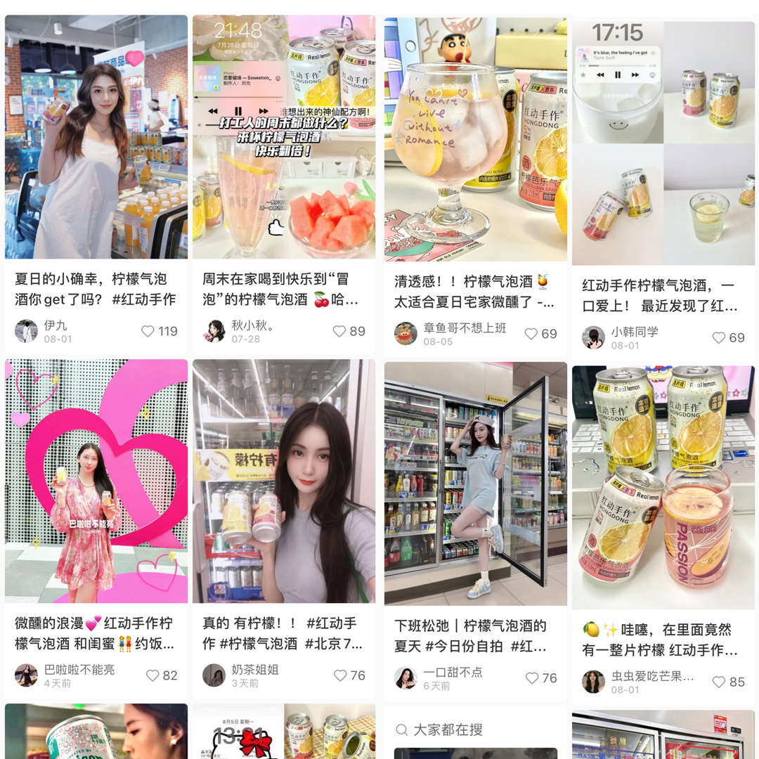 在种草平台小红书上,红动手作柠檬气泡酒更是凭借着超高颜值、全新体验和曼妙口感,获得了不少KOL和KOC的青睐。从发布的笔记和视频来看,这款柠檬气泡酒已经不再是单纯的一款新品酒,更是年轻人对高品质健康生活的一种态度,成为他们社交场上彰显品质的一个重要标签。